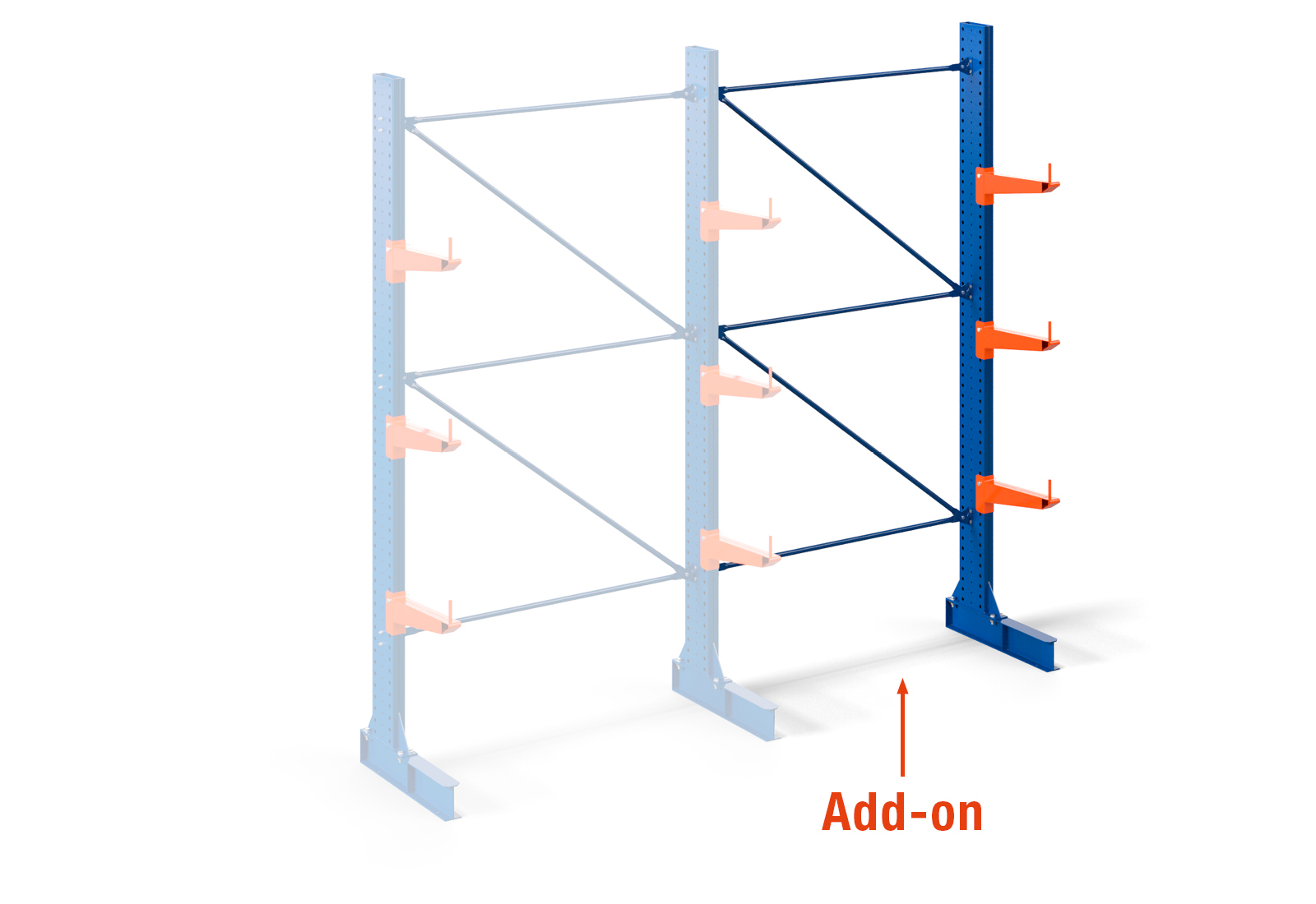 Single-sided: The add-on consists of a 98 7/16" upright with four cantilever arms featuring a 19 11/16" arm depth and a usable depth of 17 3/4", a 31 1/2" base, and 59 1/16" bracing to support the overall structure.
