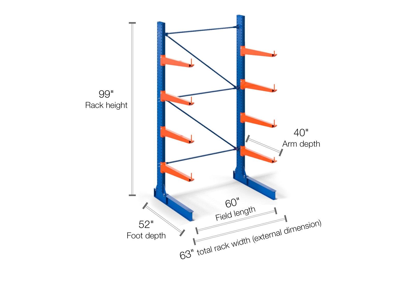 - 1 x Single-sided Cantilever Rack KR3000 / 99" H x 63" W / 4" Lip / 4 Levels / 40" Cantilever Arm Depth / 8 Arms / 3,300 lbs Weight Capacity / 1,100 lbs per Arm